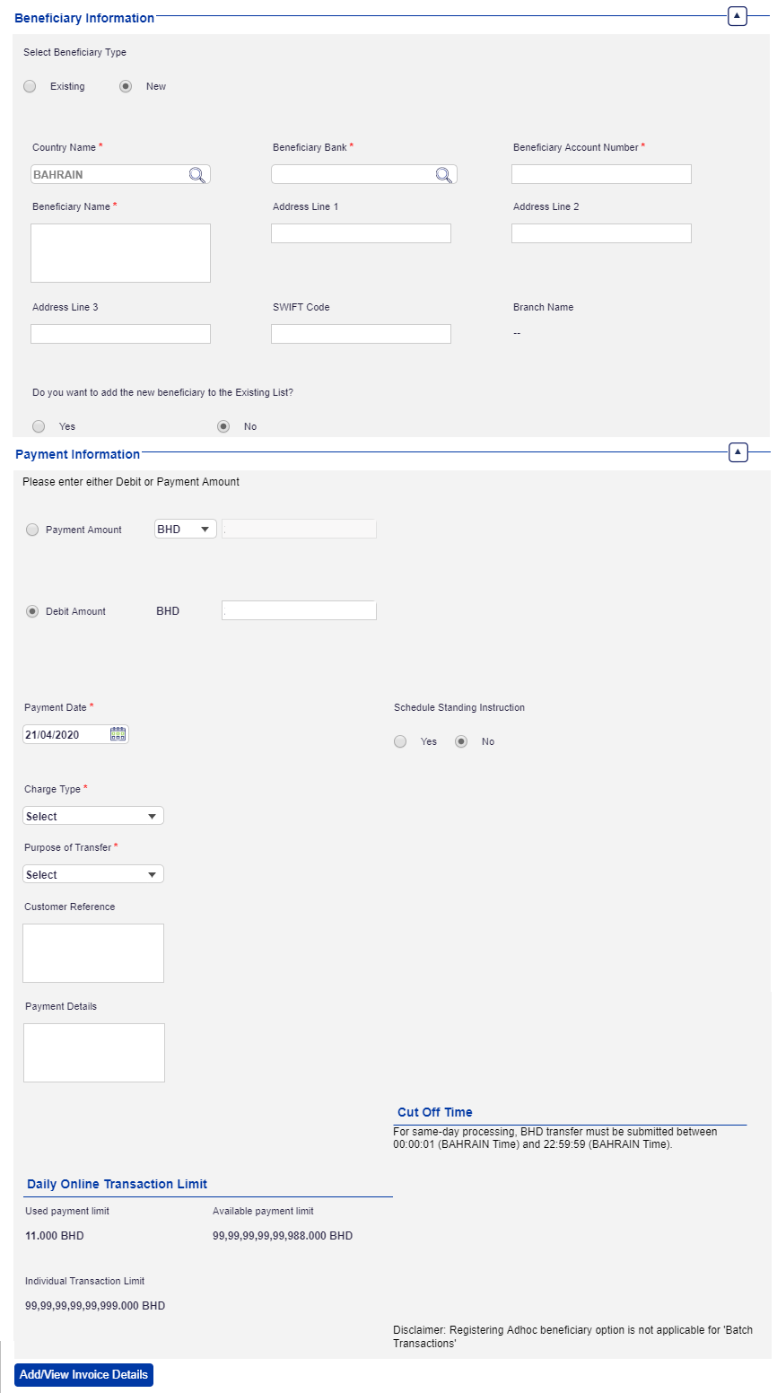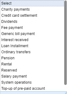 Click to view types of fund transfer options under Payments